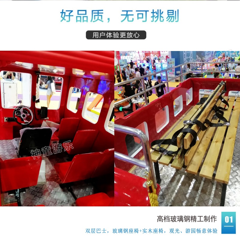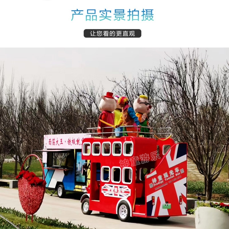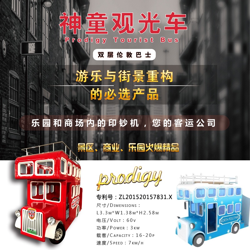 神童觀光車特色:豪華玻璃鋼材質(zhì),堅實輕巧絢麗有光澤;雙層倫敦巴士逼真造型,款式新穎;巴士車全方位的操控配置,體驗駕駛樂趣;自帶4路監(jiān)控錄像,無死角即時監(jiān)控巴士周遭環(huán)境,便于安全駕駛;雙層設(shè)計,上下皆可乘坐,最多可容納15人,帶來更大收益;靈動、卓越,神童觀光車是游樂與街景重構(gòu)的必選產(chǎn)品,具備更強(qiáng)的景區(qū)競爭力!